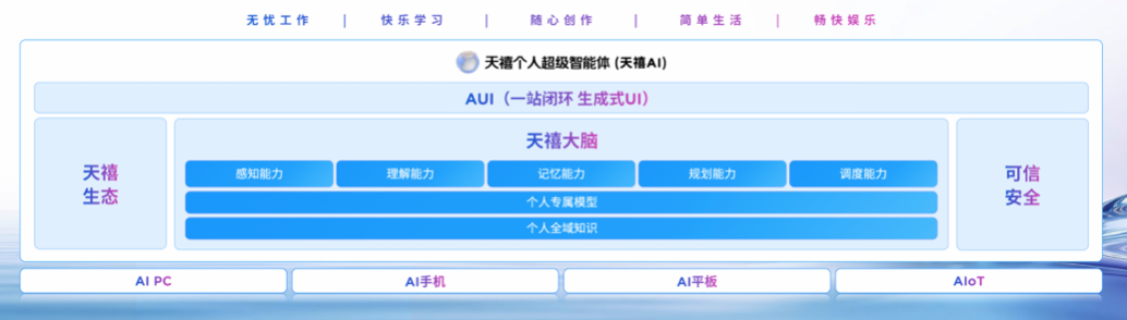 天禧AI由AUI、天禧大脑、天禧生态和可信安全平台构成,拥有感知、理解、记忆、规划、调度五大能力。天禧AI 3.5实现了“三大飞跃”:首先是个性化飞跃,依托“全时空主动记忆”技术,结合全域知识库,生成因人而异的个性化答案;第二是行动力飞跃,通过超级智能体工作群,实现多智能体协同,如AI播客、ChatExcel、超级互联3.0都是其代表应用;第三是交互体验飞跃,天禧AI 3.5具备多端协同感知,统一的AUI,让用户获得始终如一的智能体验。
