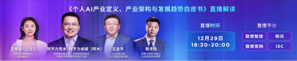 此外,联想还联合IDC率先发布《个人AI产业定义、产业架构与发展趋势白皮书》。在产业变革的大时代里,你可以在其中找到关于个人AI产业发展、大模型厂商的未来、智能体的个性化趋势等一些行业热点问题的答案,登录联想官网即可查看报告。