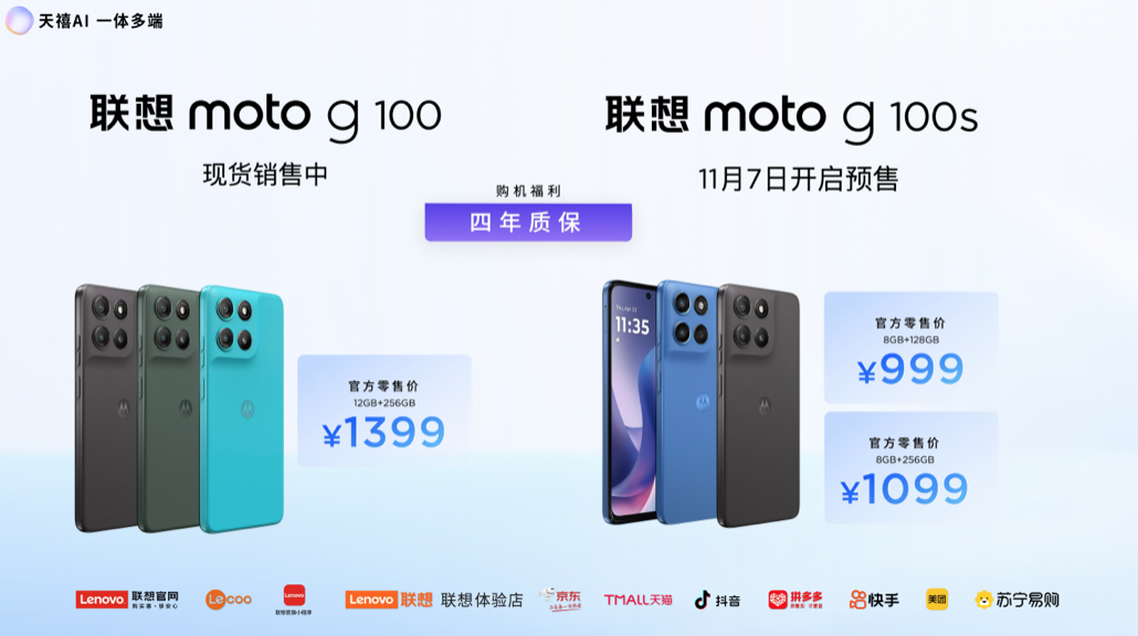 联想moto g100 AI手机已经开售,售价1399元起;联想moto g100s AI手机将于11月7日开启预售,售价999元起。喜欢LCD的朋友,一定不要错过。