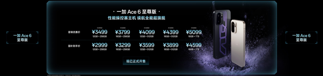 一加 Ace 6 至尊版现已全渠道正式开售,用户前往 OPPO 商城、京东、天猫、拼多多、抖音等平台,可享受以旧换新购机补贴等丰富福利。新品具体售价如下: