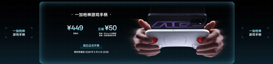 一加枪神游戏手柄,零售价449元,购买一加 Ace 6至尊版,加购一加枪神游戏手柄可享50元优惠。